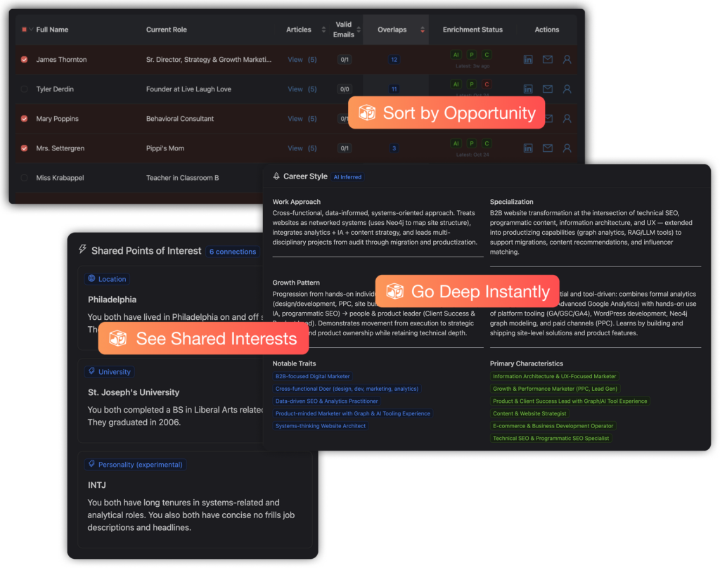 Uncover hidden connection points at scale to transform cold emails into warm conversations.